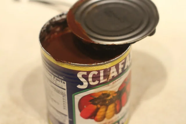 Now here is where disaster struck. I found a can of tomato puree in the pantry. The label is a brand that Trinacria carries, and it's been a while since we've shopped there. As in years. Still, it never occurred to me that canned goods can go bad.