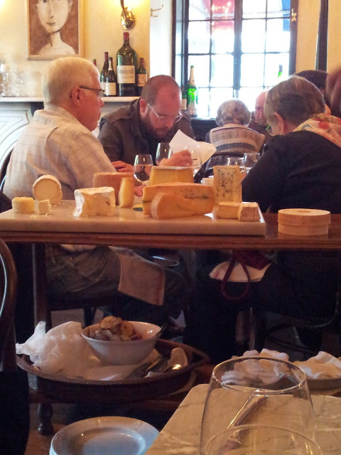 Now, here's something I love about French dining. In addition to thinking one can cook things like snails and organ meat, or that it is somehow OK to leave your poultry in a kettle in the cellar for a couple of months, the French also believe that after a nice meal, one should have a little cheese. Petit Louis has a nightly cheese cart with varieties that range from a mild Spanish-style manchego to a potent little variety that had to be stored in its own separate box. While my counterpart ordered the former, I had to go for the latter, plus an aged goat cheese to round out the selection.