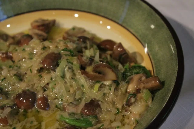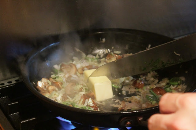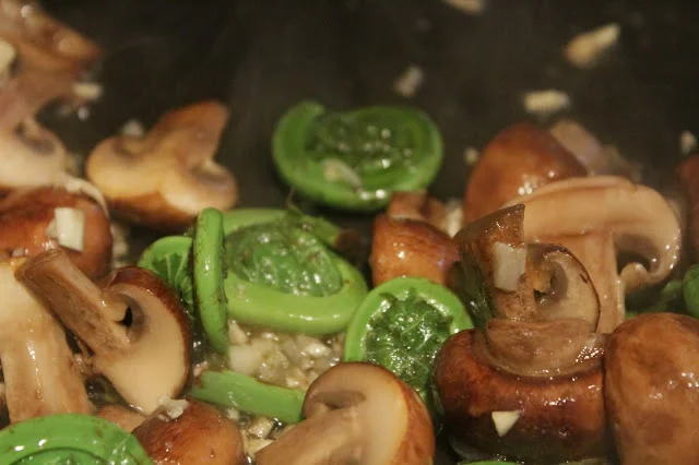 He cooked them on the stovetop, using a little wine, a little cream, and a lot of butter. The end result was tender mushrooms, crisp fiddleheads, and lots of buttery goodness. Served with bread alongside to absorb some of that fat, this dish was so flavorful, I had three servings.